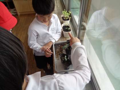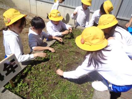 種を植えてから教室で水やりをしてきたヘチマですが、少しずつ発芽してきました。子供たちは、タイミングを見てヘチマのための花壇の草むしりもしています。これからのヘチマの成長が楽しみですね。