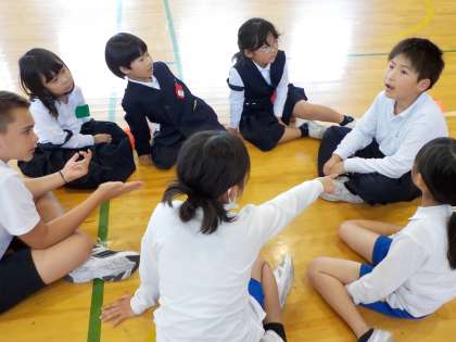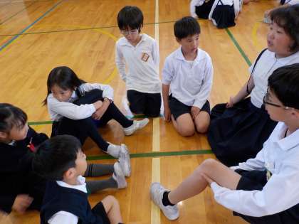 「あ→明るく」「い→いつでも」「さ→先に」「つ→続けて」を合い言葉に、すてきなあいさつを心がけましょうと呼びかけました。そのあとは、ファミリー班であいさつゲームを行いました。