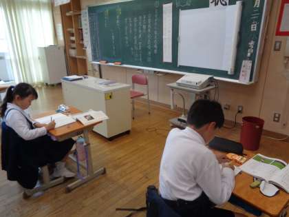 国語科では「アップとルーズで伝える」という説明文の学習をしています。自分が人に何かを伝える場面を思い浮かべながら、本文を一部引用して自分の考えを真剣にまとめていました。
