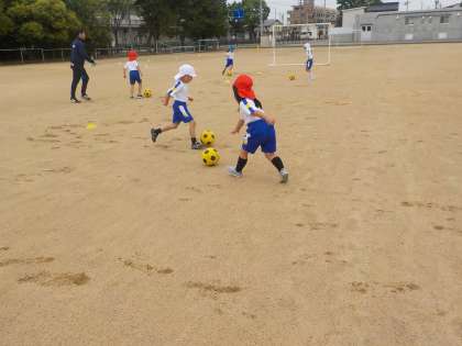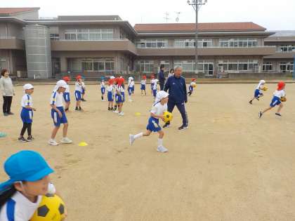 地域の方2名をお招きして、サッカー教室を行いました。低学年は、まず、サッカーボールを仲良くなるところから始めました。ボールを足で蹴るのは、とても難しそうです。