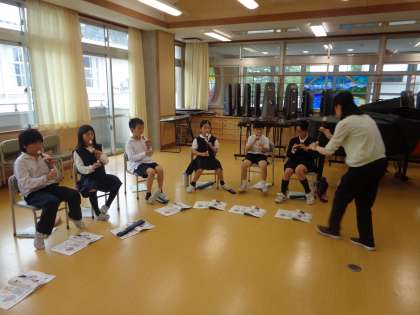 音楽の時間に、リコーダーの持ち方や吹き方を学習しました。