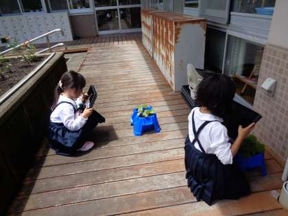 1年生 生活科の学習 公開日 2024/06/04 更新日 2024/06/04 1年生 生活科「わたしの あさがお」の学習で、アサガオの観察をしています。 今日は、クロムブックを使って自分のアサガオの写真を撮りました。