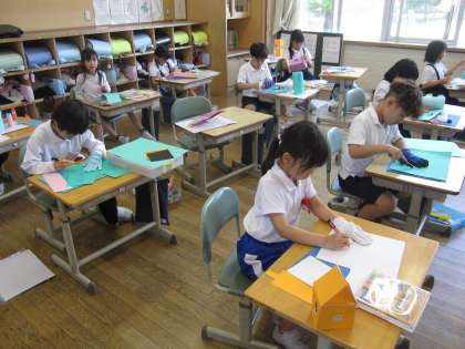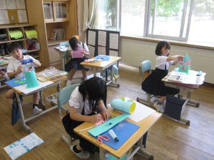 カッターナイフ等の道具を使って、窓がある建物を作っています。窓から何がこんにちはするのか、楽しみです。