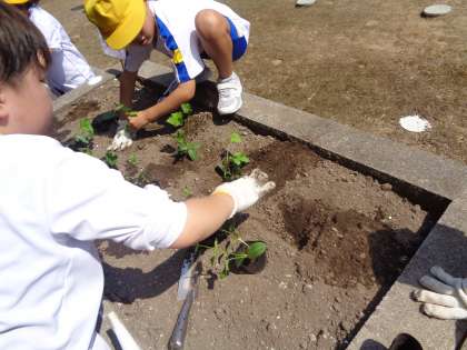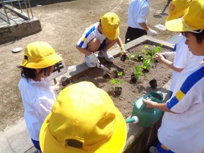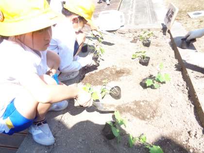 教室で育てていたヘチマが大きくなってきたので、外に植え替えました。しっかり根付くようにたっぷり水をあげました。これからの水やりにやる気いっぱいになった4年生でした。
