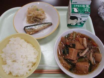 今日の献立は、ご飯、牛乳、いわしの土佐煮、はりはり和え、厚揚げと小松菜のごまみそマーボーです。厚揚げと小松菜のごま味噌マーボーは、ご飯によく合う味付けで、美味しいです。