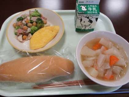 今日の献立は、コッペパン、牛乳、チーズオムレツ。きのこと豆のアヒージョ、ポトフです。