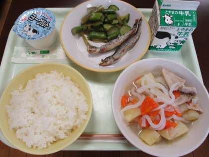 今日の献立は、ごはん、牛乳、ししゃもの米粉揚げ、茎わかめの中華和え、塩肉じゃが、ヨーグルトです。茎わかめのシャキシャキした食感が美味しいです。