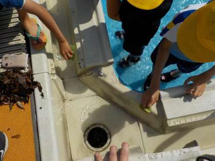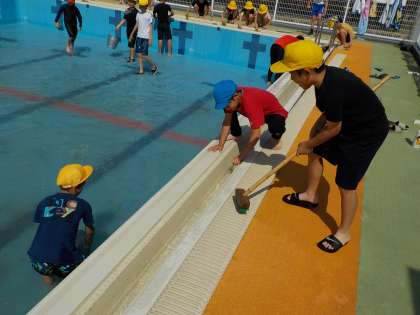 天気がよく、水が気持ちよさそうでした。デッキブラシでごしごし磨いています。
