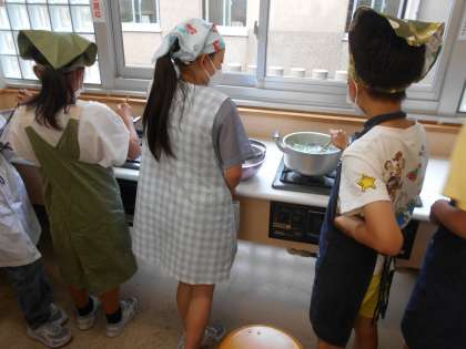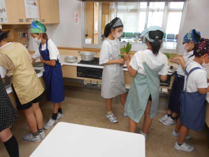 家庭科の学習で、ほうれんそうのおひたしをつくりました。班で協力して準備から後片付けまで頑張っていました。