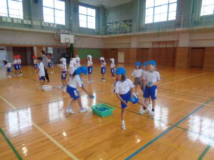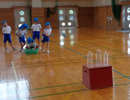 体育の時間に、ペットボトルを的にしてボール投げをしました。ボールが当たるとうれしそうに喜ぶ姿が見られました。