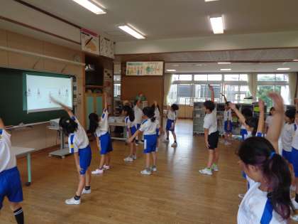 運動委員会の上級生のお手本を見て、楽しくラジオ体操をしました。