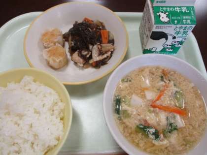 今日の献立は、ごはん、牛乳、にんじんシューマイ、もずくのチャプチェ、かき玉汁です。