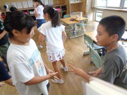 今日は2時間目と3時間目の間に、みんなで2つのゲームを楽しみました。1つ目の「〇文字しりとり」では、文字数を限定したしりとりでにこにこ笑顔になりました。2つ目の「億万長者じゃんけん」では、いろんな人とどんどんじゃんけんをしてみんなで大盛り上がりでした。