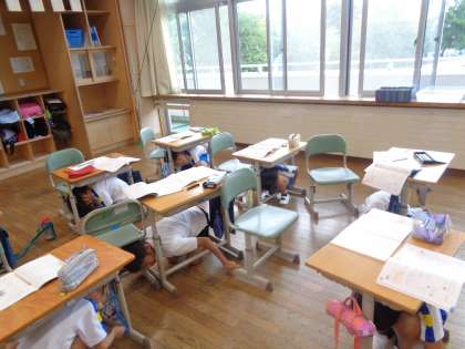 シェイクアウト訓練を行いました。地震になったことを想定して、実際に机の下に潜って身を守る練習をしました。振り返りでは、放送をよく聞くことの大切さを考えました。