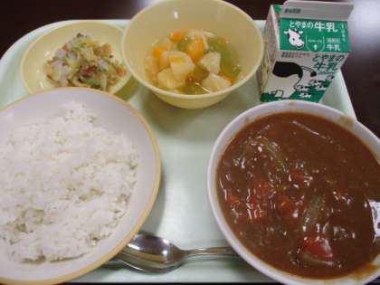 今日の献立は、ごはん、牛乳、カレーライス、福神漬け、フルーツゼリーミックスです。