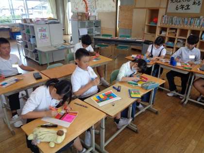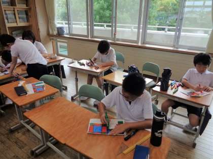 正方形と直線を用いてオリジナルデザインをつくる活動を行いました。
