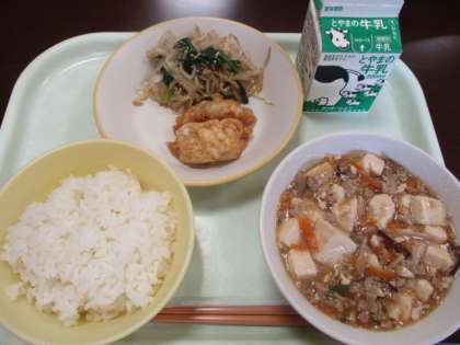 今日の献立は、ごはん、牛乳、揚げぎょうざ、塩ナムル、マーボー豆腐です。中華料理の献立は、とても美味しかったです。