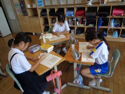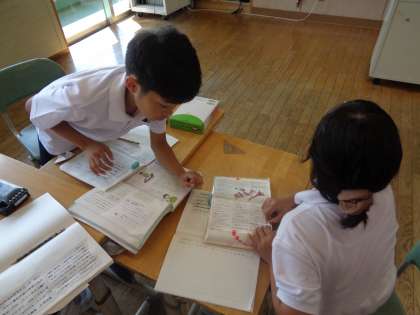 国語科の学習では、文章を書いた後どのように見直したらよいか考えました。子供たちは、言葉の使い方や字の間違いだけではなく、読む人にとって分かりやすいかどうか見直すことも大切であると気付くことができました。最後には、例文を分かりやすい言葉に直したいと、国語辞典を持ってきて調べる様子も見られました。