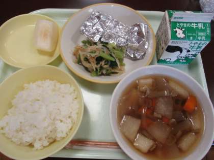 今日の献立は、ごはん、牛乳、さばの銀紙焼き、はりはり和え、冬瓜スープ、梨です。冬瓜スープは、冬瓜が柔らかく、スープもとても美味しかったです。
