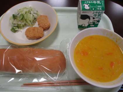 今日の献立は、コッペパン、牛乳、チキンナゲット、グリーンサラダ、かぼちゃポタージュです。かぼちゃポタージュがとても美味しかったです。