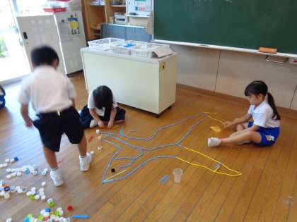 紙コップやストロー、数え棒、ペットボトルキャップ等を並べて様々な形を作りました。
