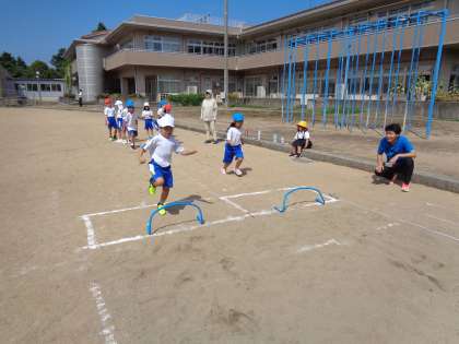 今日のチャレンジタイムに、1年生は走り幅跳びに挑戦しました。片足で踏み切り、両足で着地する練習を行いました。何度も繰り返し練習するうちに少しずつ遠くに着地できるようになってきました。