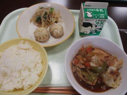 今日の献立は、ごはん、牛乳、小籠包、チンゲンサイひたし、回鍋肉です。