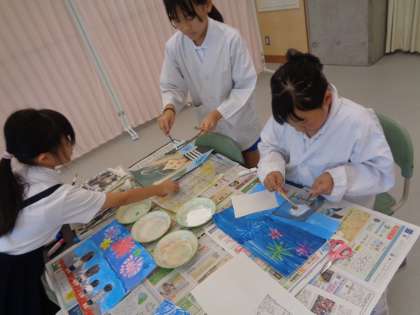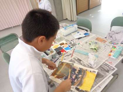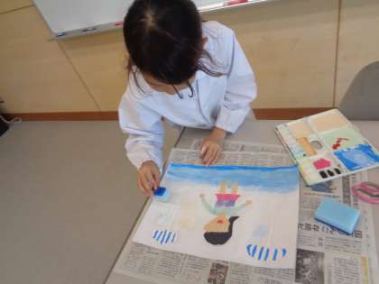 図画工作科では、表したい気持ちに合わせて「勢いが良い感じにしてすっきりした気持ちを表したい」「スポンジを使ってあたたかい気持ちを表したい」と、自分なりの思いをもちながら作品づくりに取り組みました。