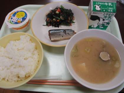 今日の献立は、ごはん、牛乳、さんまの生姜味、大豆とひじきのごま和え、団子汁、お月見ゼリーです。