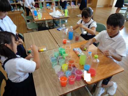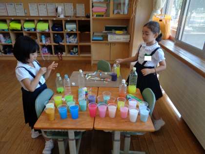 色を混ぜてどんどん新しい色ができあがると、友達と伝え合っていました。ジュース屋さんになりきったり、研究者になりきったりと、思い思いに楽しんでいました。