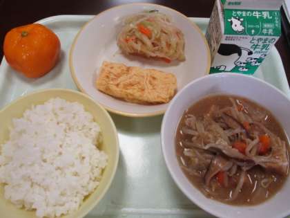今日の献立は、ごはん、牛乳、卵ロール、バンサンスー、厚揚げの中華煮込み、冷凍みかんです。冷凍みかんが冷たくて美味しかったです。