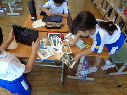 図画工作科の学習では、アートカードを使って鑑賞をしました。アートカードに載っている作品のポーズをまねしてみることで「なんだか怒っている感じがするな」「力強い感じ」と、そのポーズの感じを楽しんでいました。