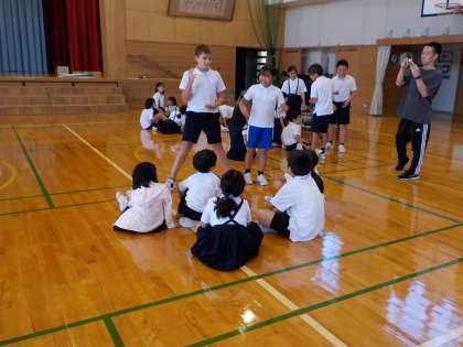 縦割り班(ファミリー班)の仲を深めようという目当てのもと、班でジェスチャーゲームやフラフープ通し等の交流をしました。自然と笑顔になり、温かい雰囲気に包まれた集会でした。