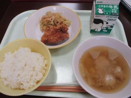 今日の献立は、ごはん、牛乳、豚肉の香り揚げ、いり大豆和え、つみれ汁です。豚肉の香り揚げは、大きくて食べ応えがありました。