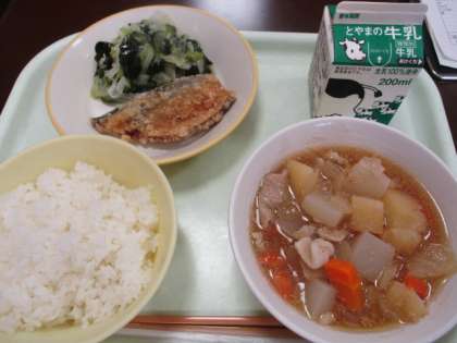 今日の献立は、ごはん、牛乳、さばの竜田揚げ、酢の物、豚肉の炒め煮です。