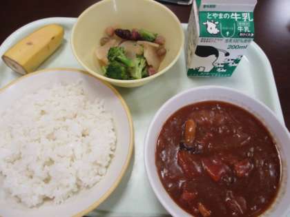 今日の献立は、ごはん、牛乳、たべキリンハヤシ、ビーンズサラダ、バナナです。給食のハヤシライスは、子供たちの大好きな献立です。