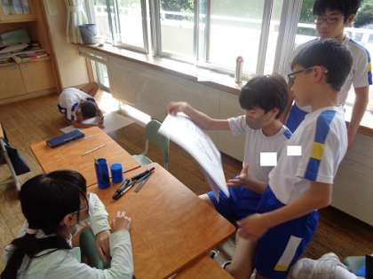 10月2日(水) 6年 ファミリー活動に向けて 公開日 2024/10/02 更新日 2024/10/02 6年生 ファミリー活動で色塗りをするために、班ごとにデザインした判じ絵の線画を完成させました。
