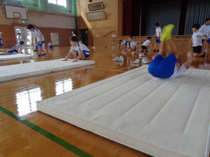 マット運動をしました。前転や後転だけではなく、開脚前転や開脚後転にも挑戦しました。足や手の位置を意識して練習することができました。
