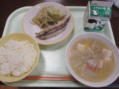 肌寒い一日です。今日の献立は、ごはん、牛乳、ししゃもの米粉揚げ、茎わかめの酢の物、さつま汁です。温かいさつま汁が美味しいです。