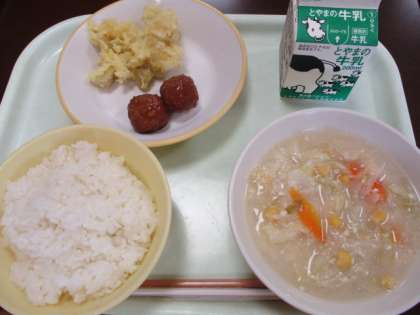 今日は就学時健診のため、いつもより早めの給食です。今日の献立は、ごはん、牛乳、ミートボール、チーズおさつ、豆乳野菜スープです。さつまいもとチーズがとても美味しかったです。