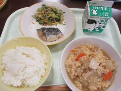 今日の献立は、ごはん、牛乳、さばの味噌煮、いり大豆和え、卵とじです。