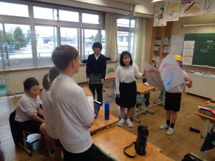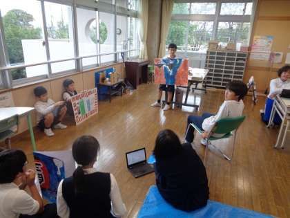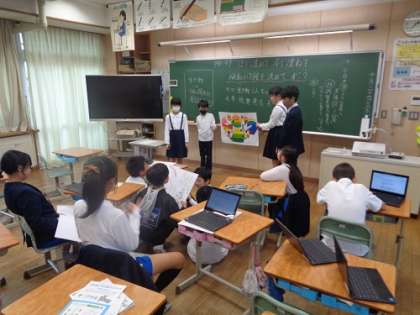 ファミリー班判じ絵発表会に向けて、5・6年生合同で練習を行いました。