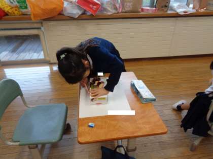 算数科「かたち あそび」の学習では、様々な形の空き箱を使って電車やタワーをつくったり、形を写しとったりしました。遊びながら、形の特徴に気付くことができました。
