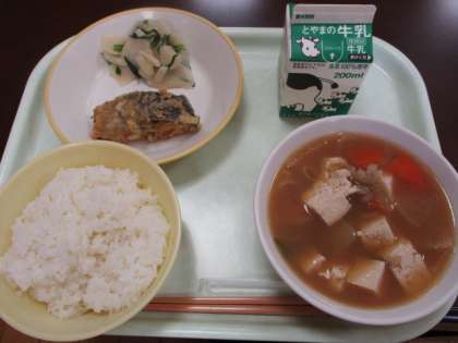 今日は「きときとランチの日」です。きときとランチでは、富山県の郷土料理や特産品などを取り入れ、富山らしさを感じることのできる献立を実施します。今日のきときとランチは「魚のえごま揚げ」です。鯵にえごまの葉が入った衣をつけて揚げてあり、とても美味しいです。そのほかの献立は、ごはん、牛乳、かぶの色どり、根菜汁です。