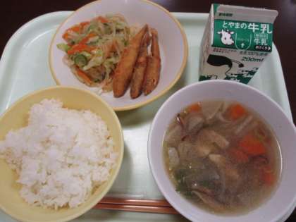 今日の献立は、ごはん、牛乳、わかさぎのフリッター、バンサンスー、サムゲタンスープです。サムゲタンスープとは、鶏肉に餅米や高麗人参などを詰めた韓国の伝統料理です。給食では、鶏肉や大根、にんじん、ごぼう、たまねぎ、干ししいたけなどと蒸しもち麦を入れたスープにして味わいました。