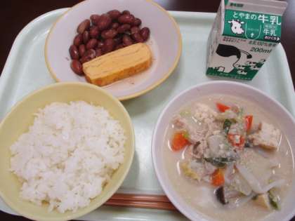 今日の献立は、ごはん、牛乳、厚焼きたまご、煮豆、ごま豆乳鍋です。寒くなり、温かい鍋がおいしい季節になりました。