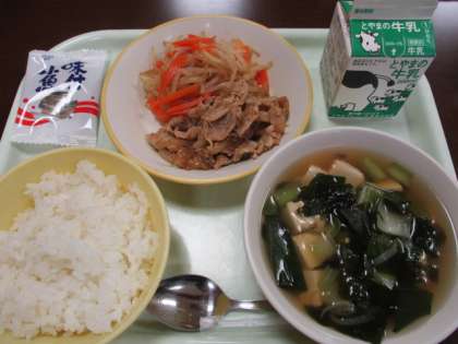 今日の献立は、ごはん、牛乳、焼き肉丼、ナムル、中華スープ、味付け小魚です。ご飯に焼き肉とナムルを載せて食べると、とても美味しいどんぶりになりました。