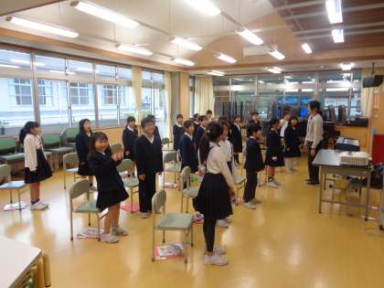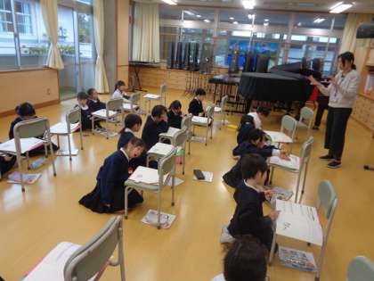 音楽科の学習では、「夕やけこやけ」の曲を歌っています。どんな景色かを思い浮かべながら、気持ちを込めて歌いました。