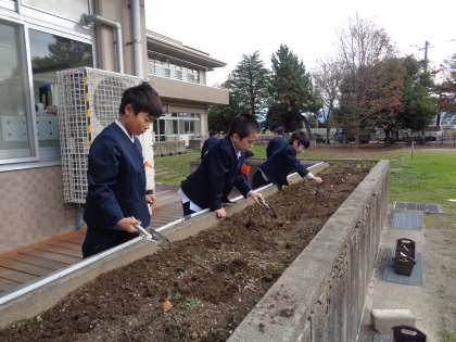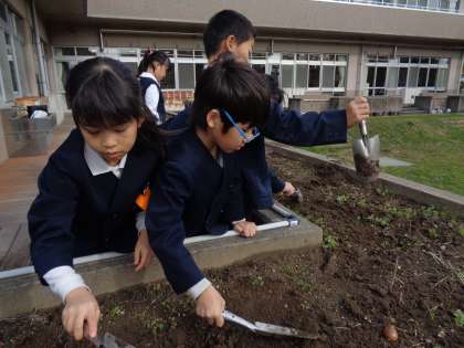 3年生みんなで、チューリップの球根を学級の花壇に植えました。春にきれいな花が咲くとよいです。