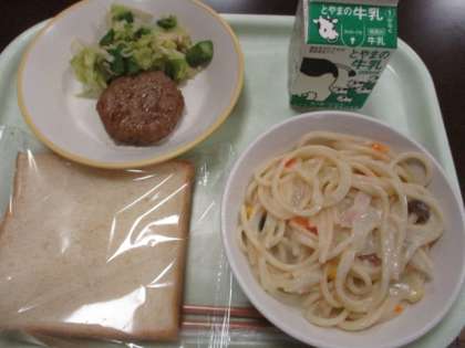 今日の献立は、食パン、牛乳、鶏つくね、切り干し大根のサラダ、クリームスパゲッティです。